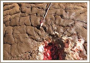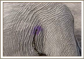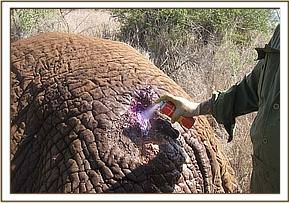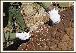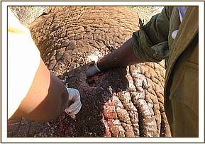 The two elephants attended to in early Match and mentioned above were from the same family and are thought to have been injured across the border in Tanzania. One, a ten year old female had two spear injuries, one at the axial (inner) side of right carpal joint. This injury was quite deep and the carpal bones could be felt on probing. The other was on the left mammary gland going under the skin up to the right gland. Examination revealed that the chest cavity was not affected. Both wounds werefresh without any infection. They were cleaned and treated topically and systemic antibiotics given. The prognosis is guarded because of the injury on the leg which could complicate healing if the joint becomes infected.