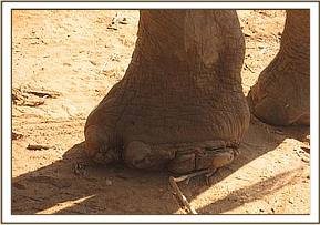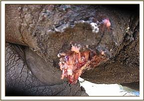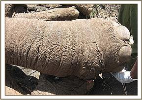 Another case was that of a female buffalo at Satao in Tsavo East with both hock joints injured possibly from a predatory attack. It was in poor body condition, dehydrated (sunken eyes) and was unable to stand. It was euthanised to prevent further suffering. Also euthanised was a bull elephant at Olbili near Ol Donyo Wuas with a serious injury at the lower left fore leg near the carpal joint possibly from a spear that entered at the anterior and exited from the posterior aspects of the leg. The carpal bones were also affected and grating sensation of the bones could be felt when probed with a pair of forceps. There was heavy infection and the joint was likely infected. Much of the sole was detached from the foot pad. The entire leg was swollen and the animal could hardly move when approached on foot for darting as approach by vehicle was impossible because of bushes and rocky terrain. It moved only about five metres before the effects of the immobilisation drug took effect and it went down. We considered euthanasia the best option to stop further suffering.