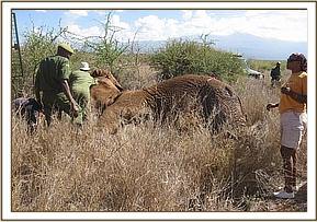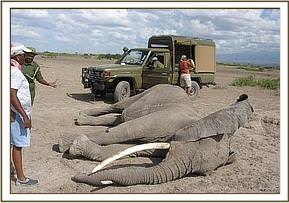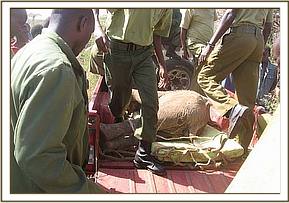 On the same day we were requested to examine and advice the way forward regarding a sickly 20 year old elephant bull on the Tanzanian side of the border. The elephant had been seen in the same general area for four days and was neither feeding nor searching for water. The body condition was poor. It had no physical injuries. It would occasional stretch the legs which could have been a manifestation of abdominal pain. Groaning vocalisation and occasional kneeling on the front legs were some of the other signs reported to us. These were however not observed in the period we examined the elephant. There was no feasible treatment that could be given. Poisoning in the farms across the border in Tanzania was suspected. The elephant was to be monitored and a further decision was to be made depending on the progress. It was put down several days later at the same spot after its condition deteriorated.