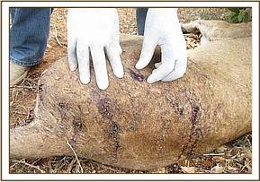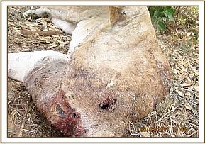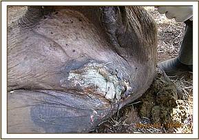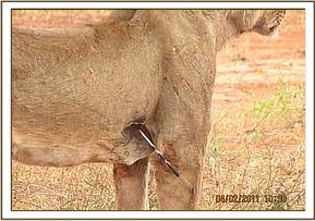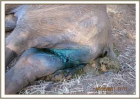 Severe wounds on the perineal area coupled with urinary incontinence were observed and the tail was severed completely,this injuries are suspectedly caused by hyenas after the calf was abandoned/ separated.
