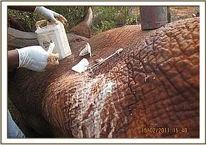 Darting was done on foot using Dan inject propelled dart containing 18 mgs of etorphine at 1528 hrs and it took 5 minutes for the elephant to go down.