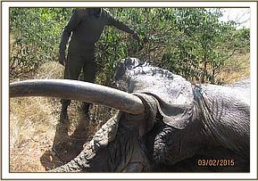 The mother was immobilized using 16 mgs of Etorphine propelled by a Dan inject and went down after 10 minutes while the one year old calf was restrained manually after which he was also injected with 2 mgs of Etorphine intravenously to calm him down. A tight cutting wire snare on the left front limb was cut loose, the deep wound cleaned using water mixed with Hydrogen peroxide, then doused with iodine and covered with green clay.