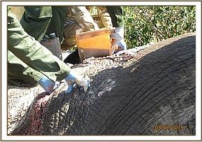 The necrotic tissue was then removed and the wound cleaned using water mixed with Hydrogen peroxide. The wounds were sprayed with tincture of iodine and covered with green clay. Long acting antibiotics and anti-inflammatories were administered by injection and Water was splashed on the ears to keep the elephant cool as the day was hot.