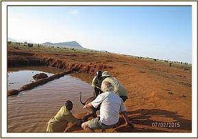 During the dry seasons like the one Tsavo is currently experiencing, elephants search for water in all possible areas including water leaks from the Mzima pipeline that transports water to Mombasa. The deep hole made by digging elephants is too steep for juvenile elephants to climb out hence they need rescue. About 5 elephant calves have died in the water hole in the last four months. One of the calves that fell was rescued from the water hole and reunited with his mother despite the risks of the mother attacking the elephant calf.