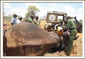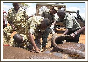 The operation was scheduled in the cool hours of the morning and late afternoon in order to minimize complications caused by high temperatures that currently prevail in the Tsavo region. 3 cc darts filled with 17 mgs of Etorphine and 18 mgs and 1000 i.u of Hyalase were used to immobilize cows and bulls respectively. The darts were propelled by a gas operated dan-inject dart gun from the safety of a Helicopter. The Helicopter was also used to herd the darted elephant close to the roads and away from thick bushes and bad terrain in addition to provision of security to the ground team.