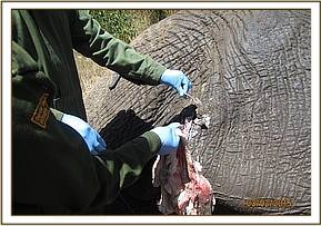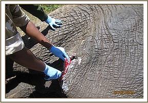 There was a swelling on the left abdominal wall near the hind leg with necrotic flesh visible in the wound. The swelling was lanced open, necrotic tissue removed and wound cleaned using water mixed with Hydrogen peroxide. The wounds were sprayed with tincture of iodine and covered with green clay. Long acting antibiotics and anti-inflammatories were administered by injection. Water was splashed on the ears to keep the elephant cool as the day was hot.