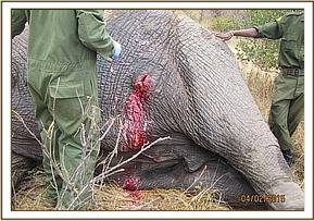 The elephant was darted with 18mg Etorphine Hcl 18mg, in a 3 ml Dan - inject dart using a rifle from a vehicle. The elephant was near a water hole and was immobilized after 8 minutes. The aircraft tracked the elephant so as to not lose the elephant in the thick bush. The elephant fell on the injured side and it took the team nearly an hour to flip him over in order to access the wounded side.