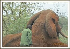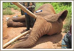 Reversal of the anaesthetic was attained by intravenous administration of Diprenorphine hcl at 3 times the Etorphine dose. He struggled to get up so a vehicle was called in and ropes were used to assist the elephant onto his feet.