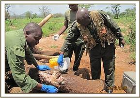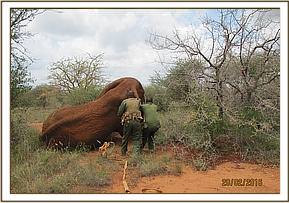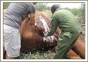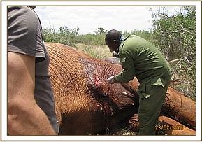 The carcass was decomposing and the tusks were easily pulled out. The surrounding ground indicated signs of struggle before death. The trunk and the facial soft tissues were eaten off by carnivores. The intestinal organs were all eaten away hence no vital organs were accessible for autopsy. There were bruise marks around the perineal area indicating blunt object hit.