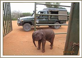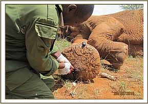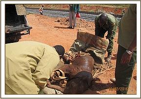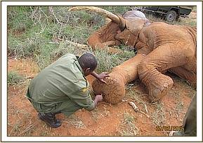 The calf appeared weak, dehydrated and in shock. He was splashed with water then transported to Voi stockade for further examination. After he was offloaded from the vehicle, he could not get up so he was administered with 20cc of 50% Dextrose I.V and 20cc Dexamethasone Hcl I.V stat and kept in the shade and cooled with water. Following treatment he was up in 10 minutes. An aeroplane was sent from Nairobi to airlift him to the Nairobi orphanage for further care.