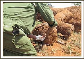 The elephant was immobilised using 18mgs Etorphine Hcl in a 1.5 ml Dan - inject dart from the helicopter using a Dan-inject dart rifle. The elephant was guided by the DSWT helicopter to an open area and was immobilized after 12 minutes. The bull went down on the injured flank and a rope and a vehicle were used to flip him over to access the injured side. A penetrating arrow wound was observed to the left abdominal wall with an accumulation of pus below it. An incision was made at the lowest point of the wound so the pus could be drained and the dead flesh cut out. The wound was cleaned using water mixed with Hydrogen peroxide then sprayed with tincture of Iodine before wetted green clay was applied.