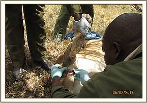 The carcass was lying on the left flank with the face chopped off and tusks recovered by KWS rangers. The carcass was fresh and the front right limb was swollen and bone fragments visible from the skin. Autopsy revealed complete facture of radial and fibula bones. Cause of the fracture was a high velocity projectile (bullet) from the attempted poaching. Cause of death – Haemorrhage from bullet shot