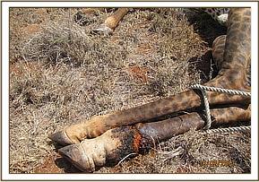 The giraffe was immobilized using 12 mgs of Etorphine mixed with 60 mgs of Xylazine. It took 10 minutes for the anesthetic to take effect and the giraffe was roped down to lateral recumbency. The anesthesia was immediately reversed using Diprenorphine mixed with Naltrexone and Atipemazole Hcl administered through the jugular vein and the giraffe held down by the neck for snare removal.