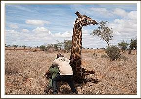 Shortly after de-snaring the waterbuck, a giraffe was spotted with a tight wire snare around its lower leg near Taita lodge.