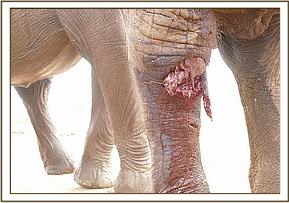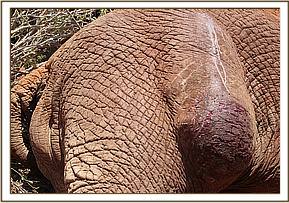 This young elephant, a former DSWT orphan, was attacked by a lion while foraging near Ithumba Park Headquarters with other former orphans. He was saved by one of the other older orphans and then his herd lead him back to the stockade for safety where the keepers reported the injury.