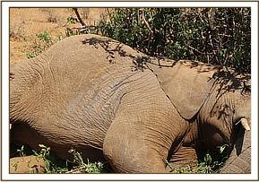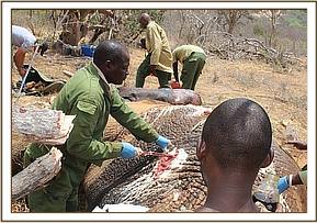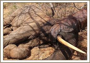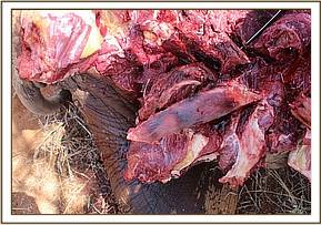 The carcass was lying on its flank with blood oozing from the nostrils, mouth and vaginal and anal openings. The blood wasnt clotting and there was evident bloating of the carcass. The area was dry with little forage left.