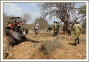 The elephant was easily darted from the helicopter using 18mgs Etorphine in a 3 ml Dan - inject dart. After it was successfully darted, the helicopter followed the elephant from a distance until he went down on sterna recumbency after 8 minutes. The sitting position posed a threat as the elephant cannot breathe well. The helicopter landed and the team rushed in and pushed him into a lateral position but unfortunately he fell on the injured flank. A tractor was called in to assist with flipping the elephant over.