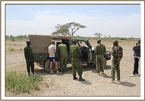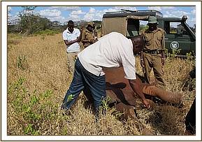 A dart was prepared and loaded with 16mgs of Etorphine after which the cow was darted from a chopper. She was immobilized in 6 minutes.