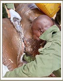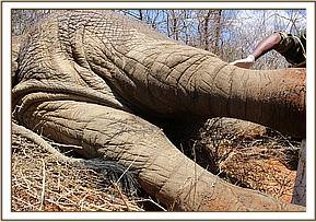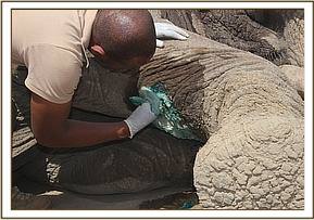 The elephant was darted with 18mg Etorphine from a vehicle using a Dan-Inject rifle. He was then followed from a distance until he went down on sternal recumbency after 9 minutes. He was pushed to lateral recumbency which revealed a penetrating wound to the upper thigh area near the lumbo-sacral area with huge accumulation of pus stretching down to the knee joint area.