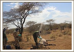 The senior warden of Tsavo West National Park reported the sudden death of a zebra near Kitani Severin camp that morning. The team rushed to the area to find the bloated haemorrhaging carcass nearby.