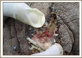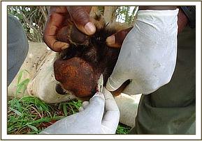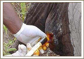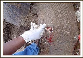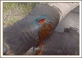 Two elephants, a male and a female, were reported with injuries on 7th January. Both had septic spear wounds (about 3 inches long), the male at the lower right abdomen penetrating into the abdominal cavity and the female at the lower right fore leg and also a small superficial injury at the perineal area probably sustained as the animal scratched itself against an object. The female seemed to be in a lot of pain and avoided putting weight on the leg. Both animals were immobilised with Etorphine Hcl (M99®). The female required a second dart to effect immobilisation as the first one did not discharge fully.