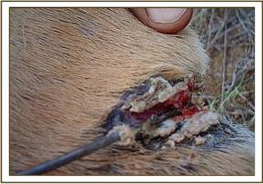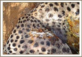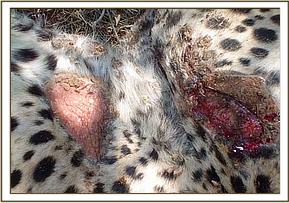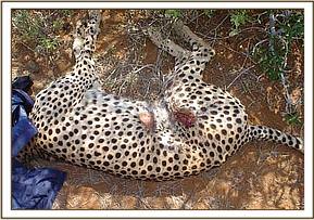 An injured Cheetah was reported and treated at Aruba on the 10th Jan. It was a female with fresh wounds on the left hip and on the abdomen probably inflicted by its prey. Immobilisation was achieved by ketamine and xylazine Hcl both at 120mg in the same dart. The injury on the hip was deep and was treated and sutured with chromic cat-gut sutures which will eventually be absorbed by the body. The injury on the abdomen was superficial and involved the top layers of the skin only. The animal was given an antibiotic cover of Amoxycillin (Betamox®). Xylazine was reversed with 15mg of Atipamezole (Antisedan®). Ketamine however, has no reversal agent but it gets metabolised and excreted within a few hours. The animal was observed until it recovered its effects. The prognosis for its recovery is good. The cheetah was subsequently monitored and was fed with 5kg of beef meat on 12th Jan after it was found still alone and hungry. The wound on the hip was observed to have apposed nicely. It was again sighted on the 13th Jan but was lost thereafter and has not been seen again to date. Hopefully it rejoined its group.