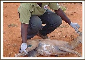 Two out of three Grants Gazelles with mange were immobilised and treated with Ivermectin on 18th and 21st Jan near Sala Gate. The two were ear notched after treatment for identification to avoid any mix up just in case others come down with the disease. They are still being monitored for response. Attempts to dart the third one were futile as it was unapproachable to within darting distance. After a prolonged attempt it became over excited and ran into very difficult terrain. It will be given some time to forget the experience before we go for it again.