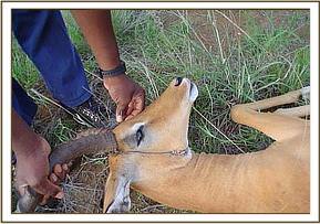 A male male impala with a wire snare around its head was sighted on the 23rd Jan as we were looking for a zebra with a snare around the neck, which was however not found. The impala was immobilised and the snare removed.