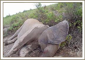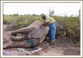 An injured Elephant in Amboseli was reported on 26 th. Jan The tusk-less female elephant had a moderately infected spear wound going through the upper part of the trunk near the base and was attended to . It had a small calf aged about 3 weeks and was in the company of a herd of about 15. After immobilisation, the other elephants were driven away to a safe distance. The wound was cleaned and a long acting antibiotic (20% Oxytetracycline) administered intramuscularly. The elephant was rejoined with the other elephants and its calf after reversal of narcosis. The prognosis for recovery is good.