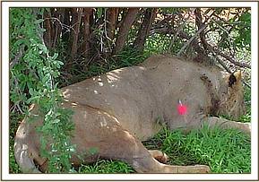 lion spotted at Ndara plains had a swelling that was confirmed by aspiration to be an abscess on the right forepaw. Before immobilisation, we thought a foreign object was lodged on the paw as the animal walked carrying the leg and seemed to be in a lot of pain. The abscess was lanced and the entire puss squeezed out until blood came out. No foreign object was found and the cause of the abscess was uncertain. It was then flushed with hydrogen peroxide before infusing dilute Lugol’s iodine and an antibiotic ointment (Opticlox®) and sprayed with a fly repellent. The animal was also given a long acting antibiotic cover (Betamox®). Dart wounds (animal was immobilised with two darts composed of xylazine mixed with ketamine) were treated with Opticlox® which was also applied to the eyes. Xylazine was reversed with Atipamezole Hcl but Ketamine has no reversal. Thus the animal remains drowsy for a few hours before the drug is cleared from the body.