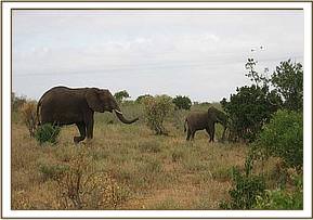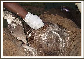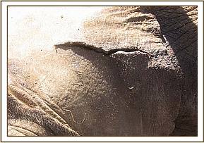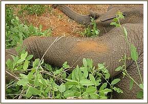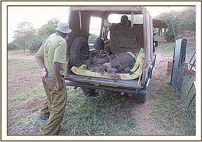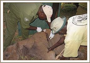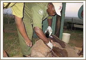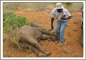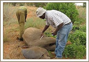 A 15 months old elephant calf in the company of an adult female and another calf was sighted at Satao limping from a swollen left fore leg. The report was relayed to the unit and we found the three about a kilometre west of the Satao camp. Though there was no visible physical injury we decided to immobilise the calf for closer examination of the problem. This was achieved with 3 mg of Etorphine hydrochloride. Upon examination, we ruled out fracture which was initially suspected. The problem was on the elbow joint which was swollen probably following some sprain in some bad terrain. It was given Dexamethasone, a corticosteroid anti-inflammatory and analgesic drug and some antibiotics. The prognosis for recovery was favourable.
