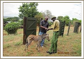 Treatment of a rescued zebra foal at Voi elephant stockades, 25th January. The zebra foal was rescued from Maasai wildlife conservation Trusts Kuku ranch conservancy after being found wondering alone. Several attempts were made to return her to the area of rescue for reunion with the mother in vain. She was brought to Voi and examination revealed severe dehydration, poor body condition and pneumonia attack.