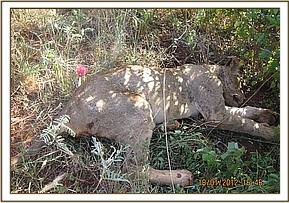 Rescue and treatment of a lioness with hind limb paralysis in Tsavo East Pipeline area, 18th January. The injured lioness was spotted by tourists trying to quench its thirst near a burst Mzima water pipeline near the Park headquarters. The lioness was immobilized using a mixture of 300 mgs of Ketamine Hcl and 3mgs meditomidine. Examination revealed lumbosacral spinal paralysis that lead to dragging of both hind limbs. She was transferred to a temporary crate near Tsavo research centre where close monitoring and rehabilitation was attempted for a week with little success. Despite adequate feeding, passage of feces or urine was not observed making the case more complicated.