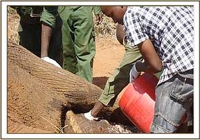 Management of a snared Elephant case in Shimba hills reserve, 24th Jan. History An elephant was reported to have been snared by poachers at Shimba Hills National Park. Veterinary and Capture team responded to this distress call on 24th day of January 2013 at 3.45 pm. Immobilization The elephant had been immobilized by a winch wire snare tied to a tree. There was no need for chemical immobilization. The elephant was on lateral recumbent position. Examination The elephant had been trapped by a winch wire snare tied to a tree. A hole had been dug and a wire snare laid and concealed with a metallic plate camouflaged by tree leaves. The animal had further deteriorated due to self inflicted internal injuries, capture stress and muscle degeneration.