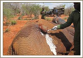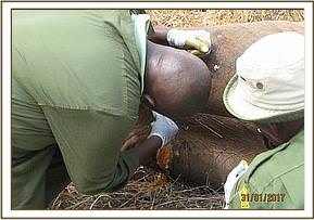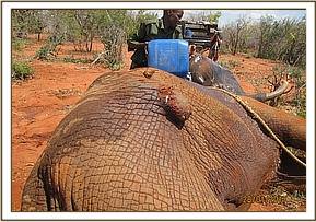 The elephant was darted from a helicopter using 18 mgs of Etorphine in a dan-inject dart. It took about 7 minutes for the drugs to take effect and it went down on left lateral recumbency. Ropes were tied to a vehicle to roll him over and expose the wound.