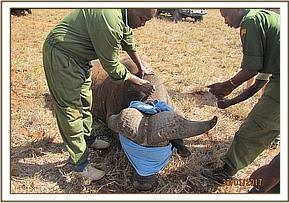 The buffalo was immobilized using 9 mgs of Etorphine mixed with 70 mgs of Xylazine and it went down in 5 minutes. The strong wire snare was removed from the neck leaving only small neck wounds. The buffalo was administered with Dexamethasone Hcl and a long acting antibiotic parenterally.