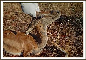 The other case was of a Grants Gazelle with mange in the same general area as the above elephant (GPS 37M 0464027E, 9629310S) sighted on the 15th. Mange is a skin disease caused by mites and characterised by itching, loss of hair and thickening and wrinkling of the skin. The lesions were widespread but were most severe on the underside of the neck,