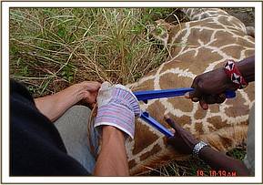 On the 19th during patrol we encountered an adult giraffe at Ndololo (GPS 37M 0456268, 9627882S) with a trailing copper wire snare on the neck in a herd of 8. The snare was loose and had not inflicted any injury. Additional personnel were sought from the de-snaring team. The giraffe was successfully immobilised with M99® and xylazine. The snare was removed and the animal reversed with M5050® and Antisedan®.
