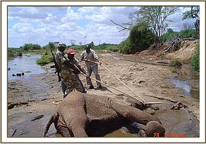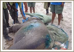 A female elephant aged 12-13 years old was seen on 20th fallen at the banks of Galana River (GPS 37M 0485775E, 9662235N). It was seen struggling but unable to stand up. It was reported to us by the rhino surveillance team but they were not sure for how long it had been in the water. The report got to us in the evening while on patrol in Bachuma area. It was already too late to make it to the site and without rangers who we didn’t have that day it would have been a very risky undertaking. This is a highly insecure area to work without armed personnel. It is also against park regulations to travel to that area at night. We were given two rangers the next morning to take us to the sight. We found the elephant too weak and unresponsive to our presence and handling. It was hypothermic (Temperature 320C) and could not be saved. It seemed like it had been in the water for a prolonged period of time judging by the whitish colour change on the underneath skin. The abdomen was also depressed considerably showing that it may not have fed for 2 or 3 days. It also looked relatively emaciated. Its chances of survival were minimal. There were however, no visible external injuries. The circumstances under which it fell were not obvious whether it fell while trying to cross the river or it rolled over the cliff. We tried pulling it from the water and turning it to the other side without success.