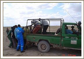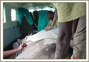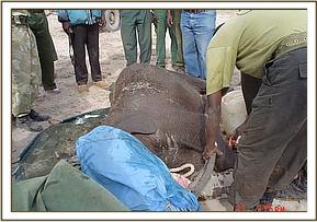 The following day (21st) the unit was requested to go to Amboseli to assist in the treatment of an elephant calf speared three times by Maasai boys. On arrival we were informed that the calf’s mother could not be traced for two days therefore necessitating rescue and airlifting to the Nairobi Orphanage. This arrangement was made with the Trust which was more than willing to receive it. The calf aged about 18months was found deep in the one of the Amboseli swamps near Maji ya Kioko area. It was driven out of the swamp after nearly three hours of concerted efforts. Once out it ran towards another swamp further a field. Since it was too strong to restrain physically it necessitated darting from a with 2mg M99® administered with the Dan-Inject rifle and thereafter herded to prevent it going back into the swamp. It went down after about 5 minutes. The wounds were examined, cleaned and topically treated, and the animal given a long acting antibiotic.