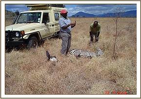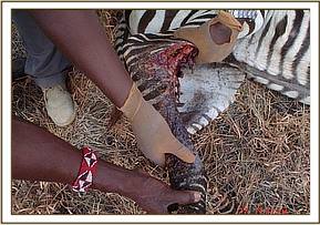 The last case in the month was of a zebra foal with the fracture of the distal tibia and an extensive infected wound on the stifle joint with torn ligaments near Voi Safari Lodge (GPS 37M 0450833E, 9633120E) on the 27th. It was immobilised and euthanased with Pentobarbitone Sodium 20% (Euthatal®) given intravenously to stop further suffering. The cause of the injury was difficult to determine but was thought to be mauling by a hyena. The injury was very severe and the animal could not be saved.