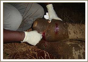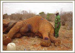 And on the 30th, we were called to treat a bull elephant that was seen at Voi Safari Lodge limping from a swollen left hind leg.