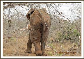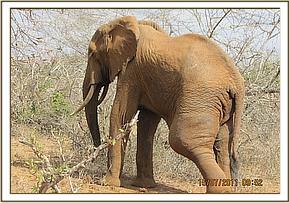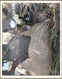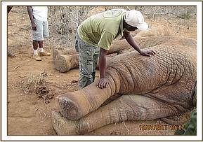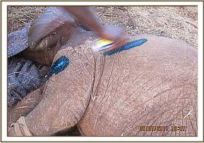 Treatment of a lame elephant bull in Kasigau area of Tsavo W. National Park, 15th July The lame elephant which is suspected to have sustained a sprain on the left leg hind leg with a suspected fusing of the left knee joint. The elephant had difficulty in movement and stayed near a water hole. Darting was done using 20 mgs of etorphine alone. Examination revealed Sprain on the joint with subsequent disorganized healing. No open wound was seen. Anti inflammatory drugs and antibiotics were administered. The elephant had to be assisted onto its feet after he was unable to stand on its own.