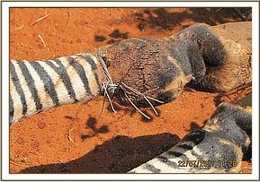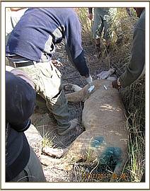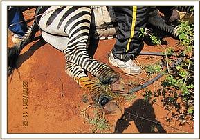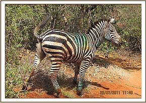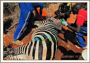 Desnaring of a zebra in Manyani field training camp in Tsavo West, 22nd July. Several cases of injured/snared cases of zebras are on the increase in manyani area of Tsavo West National Park. The zebra was snared around the hind leg and also injured by a suspected lion attack. It was immobilized by use of 7mgs etorphine and 60 mgs xylazine. The snare was removed and the wounds cleaned with antiseptics then given an antibiotic cover.