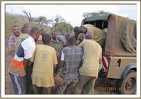 Collaring of a lioness with GPS satellite collar at Amboseli National Park, 17th July. Constant conflict between lions and the surrounding community has forced wildlife managers to intervene in order to mitigate further clashes. One of the strategies was to collar the lions, a male and a female in each pride with internet transmitting GPS collar that uses the local GSM network. This will enable data on the lions movements to be analyzed. The vet unit was called in assist in immobilization and care of the candidates. Two lionesses were earmarked for the exercise but only one was found. Darting was by use of Ketamine and Xylazine at a ratio of 300 mgs each, a further top up of 50 mgs Ketamine was added.