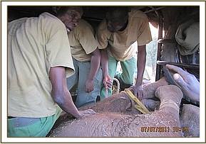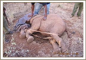 Introduction The failure of the May-July long rains in Tsavo has ushered in a dry spell in the region that paints a gloomy picture in terms of wildlife injuries as a whole. Cases of injuries and deaths from human activity seem to pick up gradually as the region dries up. Cases handled in the month were mostly caused by arrow shots, snares and other unknown injuries. Treatment of an elephant bull shot by an arrow at Ol donyo wuas area of Chyulu Hills 1st July 2011. The elephant was spotted among the male population that resides within Ol donyo wuas area with an arrow head lodged on its right thigh and the wound oozing a lot of pus. With the assistance of the Ol donyo wuas airplane the vet was airlifted to the location. The elephant was easily spotted among a group of male at the drinking hole. Darting was done using 20 mgs of etorphine Hcl in a dan inject darting system. The wounded area was enlarged and an arrow head pulled out after some struggle after which the wound was cleaned with a mixture of water and hydrogen peroxide then finally doused with iodine. Revival and prognosis It was revived using diprenorphine at three times the etorphine dose administered through the ear vein. Prognosis is very good. Rescue of an Elephant Orphan in Kedong are of Tsavo west Park, 7th July 2011. Kedong area is community farmlands adjacent to Tsavo West National Park where the prevailing drought has forced many elephants to move to greener areas occupied by the community. The calf was chasing caretakers around and had to be sedated then transferred to Voi stockades before Airlifted the next day to Nairobi orphanage.