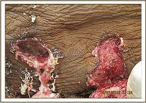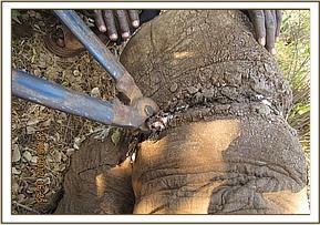 The wound located near the right inquinal area had caused accumulation of massive amounts of pus and tissue debris. An arrow head was removed and an incision made on the lowermost part of the injury to drain off copious amounts of pus. A mixture of iodine and water in one to one ratio was used to lavage the infected wound. Tincture of iodine, oxytetracyline spray and a final coat of green clay applied. The Elephant is expected to recover from the traumatic poaching attempt.