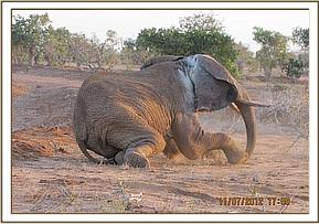 Sala gate area is in the extreme eastern boundary of the park with a population of mostly big bulls staying in bachelor groups. Injuries here are thought to be poaching attempts as the massive 6 tonne bulls have huge tusks. The bull was spotted with hanging tissues around the abdominal area.Immobilization was done using 18 mgs etorphine and took 5 minute to go down.Two big wounds in front of the preputial sheath mixed with pus and necrotic tissues were cut off, wounded site cleaned with hydrogen peroxide, iodine applied and a final antibiotic spray. A final coat of green clay was applied. The wounds are expected to heal fully.
