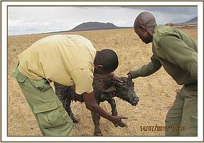 The dry spell comes with challenges of getting water especially for the highly water dependent species of Buffaloes and Elephants. A Buffalo calf got stuck in mud after attempts to drink landed it in mud. After several attempts it was finally pulled and given a shower to clean the eyes.