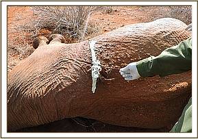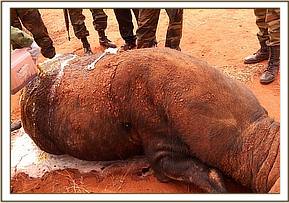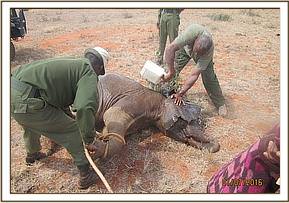 This elephant orphan, Makireti, returned to Ithumba stockade with an arrow head stuck in her left rib cage with blood oozing out. The Vet was airlifted by DSWT aircraft to the area to find the elephant inside the enclosure with others.